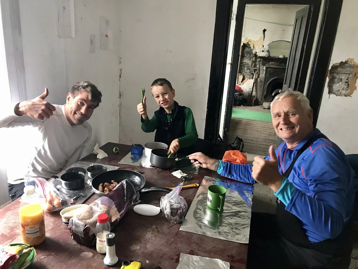 At this point, our hunger started to be noticeable. A few potatoes, half a bag of rice and a few fish was not enough for us for a couple of days of hard work. Our feet were wet, the ground was damp and Nikolai was getting moody. We had passed an old abandoned cottage the day before and Nikolai wanted to explore. As we approached the same cottage again John suggested that Nikolai check it out. As he opened the door a familiar smell greeted us. To our surprise and delight, Phil was inside preparing us a full English breakfast.
